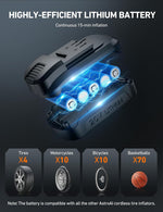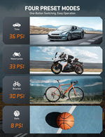 【4+N Smart Modes】: 4 preset inflation modes (bicycle 30 PSI, motorcycle 33 PSI, car 36 PSI and ball 8 PSI), more intuitive and time-saving, easy for beginners. Manual mode allows you to set any desired pressure value between 3-150 PSI.Easy to operate and use, for all your inflation needs.