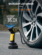 【Auto Shutoff & LCD Screen】: The intelligent design ensures safety and security. Preset your ideal value, the tire inflator will automatically shut off when it reaches the preset pressure value. The LCD screen displays both the preset value and the real-time value. The pressure unit can be easily switched between Bar, kPa, PSI and kg/cm².